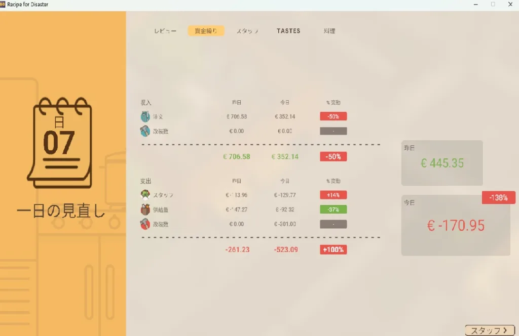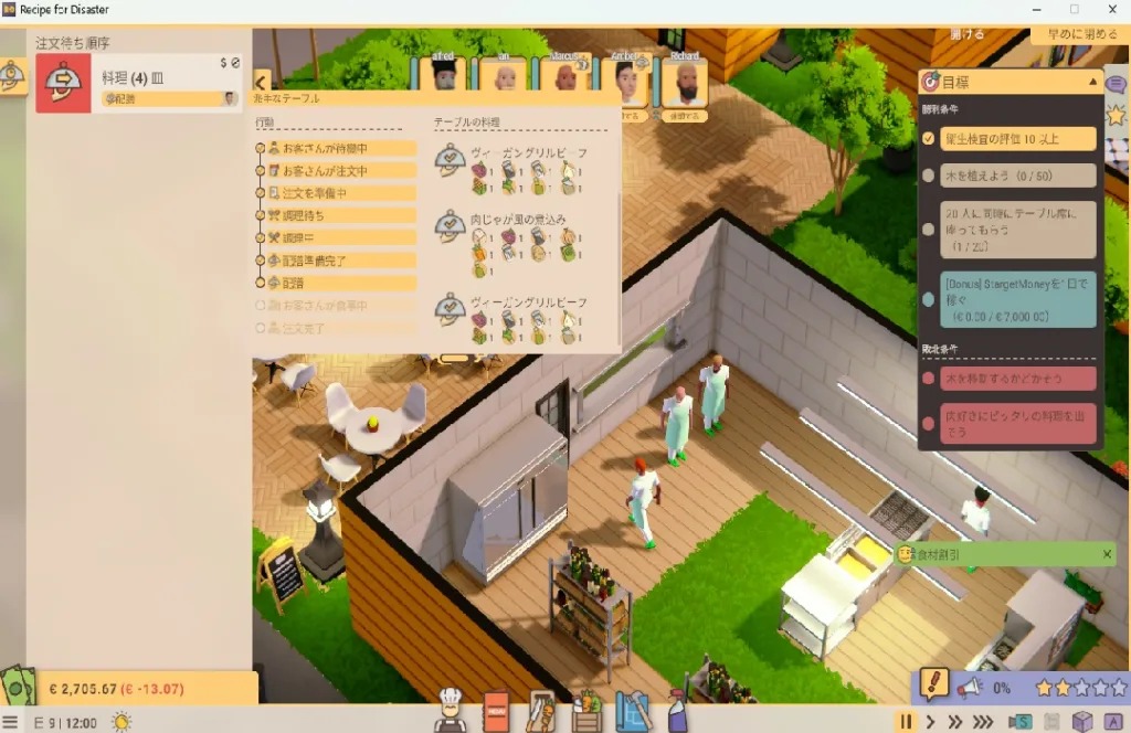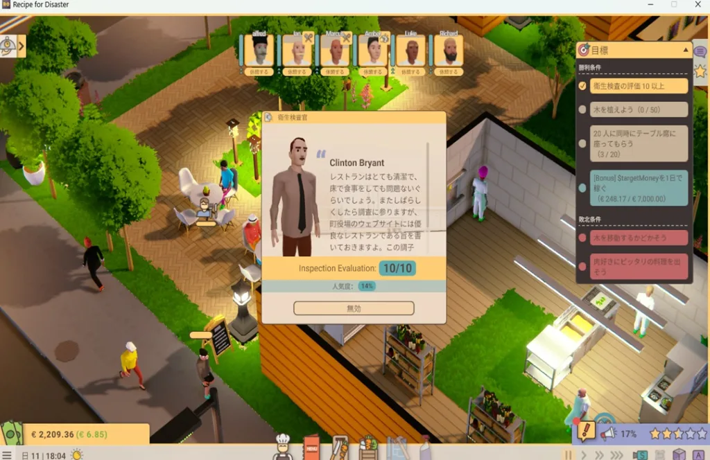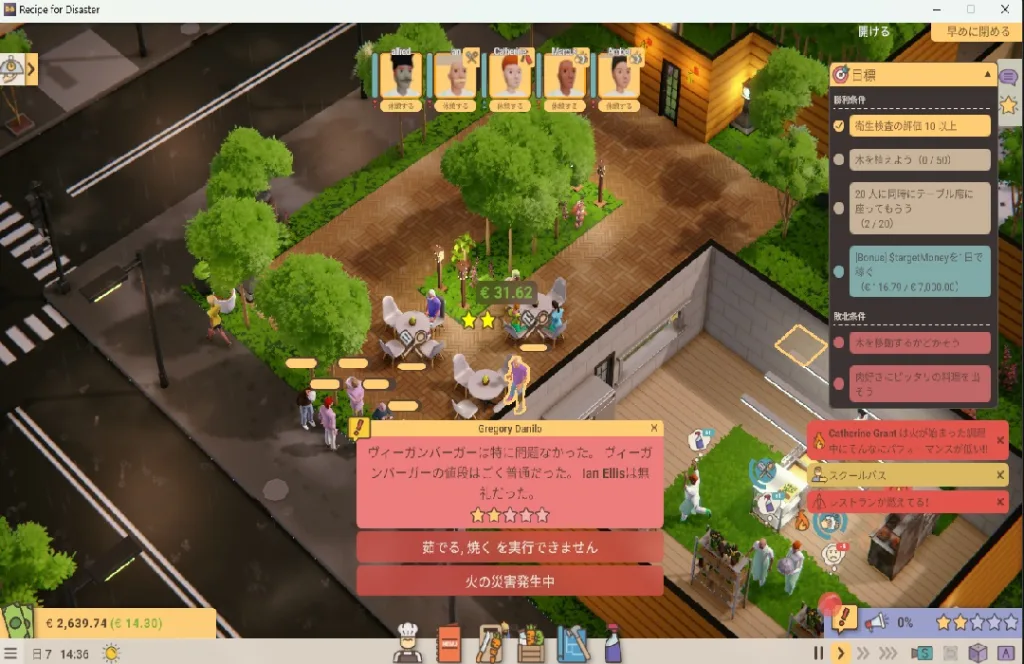 タイトルにある「Disaster(災難)」は決してオーバーではなく、厨房での火災発生、スタッフのストライキ、突然の衛生検査…これらのイベントはランダムに発生し、準備万端のつもりでも思いがけないタイミングで経営を揺るがしてくる。しかし、そのたびに「次はこうしよう」という学習が生まれ、トライアンドエラーを繰り返す中で、徐々に安定した経営が実現できるようになるのが本作の醍醐味だ。