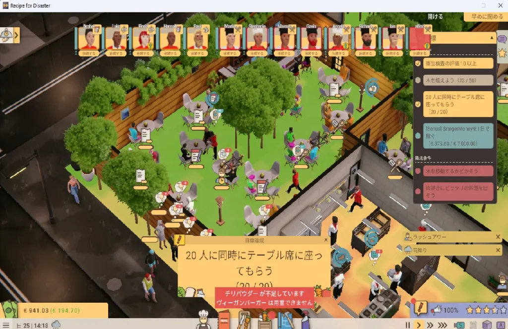本作最大の難関の一つが、顧客の多様な食の要求への対応だ。ベジタリアン(菜食主義者)、食物アレルギー保持者、特定の食材を避ける客など、様々なニーズが存在する。なかには「ベジタリアンと名乗っているのに肉を注文してくる」という一見矛盾した客も登場し、プレイヤーを困惑させる。こうした事態に備えるためにも、多様な食事制限に対応できるメニューを複数用意しておくことが不可欠である。
