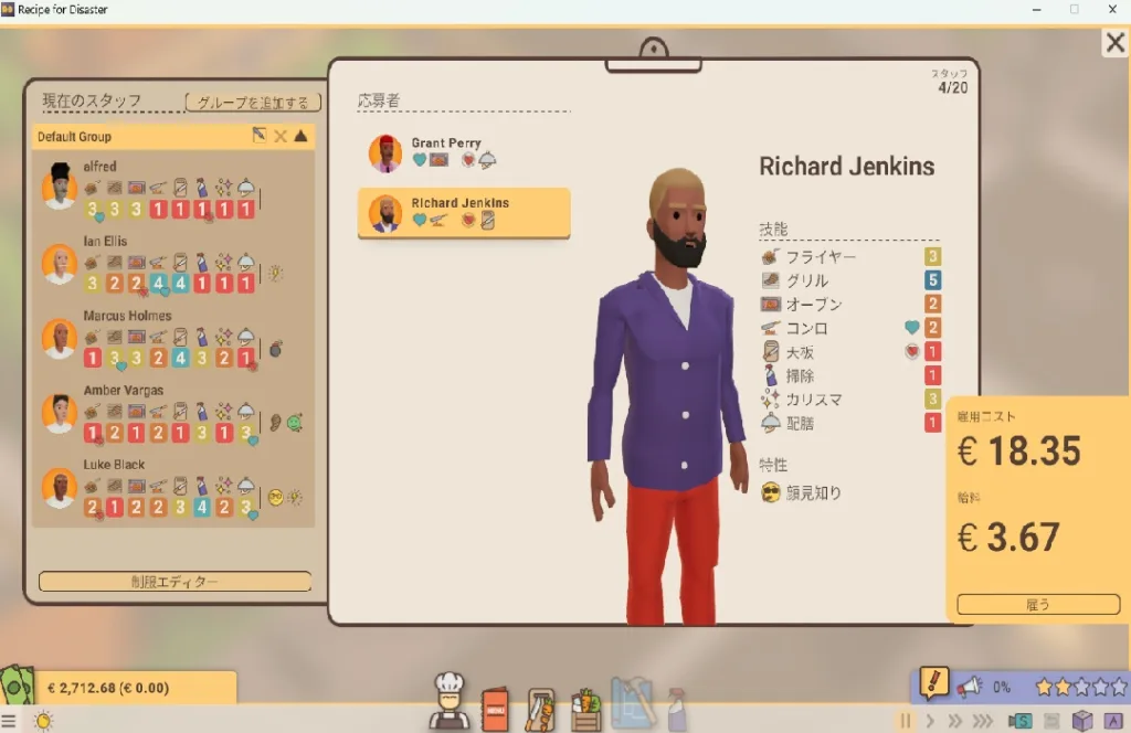スタッフの採用は、単にスキル数値だけで判断してはならない。各スタッフには固有の性格特性があり、特定のタスクを好む者・嫌う者、特定の相手と折り合いが悪い者などが存在する。スタッフ間の人間関係が悪化すると、サービスの質やオペレーション効率に直接影響が出る。採用時には性格の相性も考慮し、チーム全体のバランスを見ながら配置を組むことが安定経営への近道だ。
