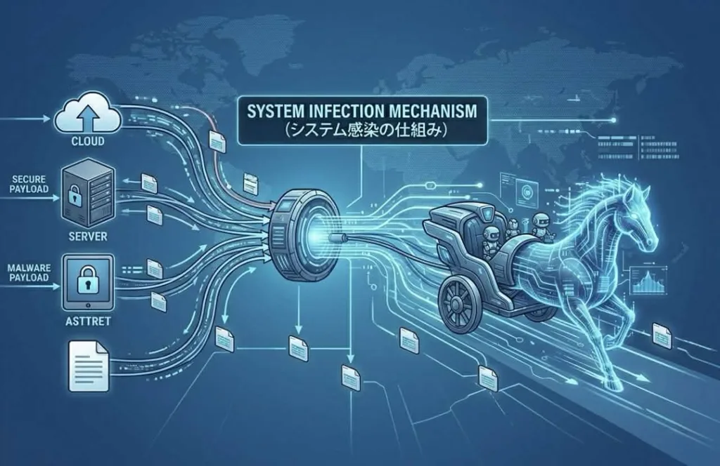 一般的なコンピューターウイルスとは異なり、トロイの木馬は自己増殖機能を持ちません。しかし、ユーザーが自ら実行してしまうことで感染し、システム内部に侵入して様々な被害をもたらします。